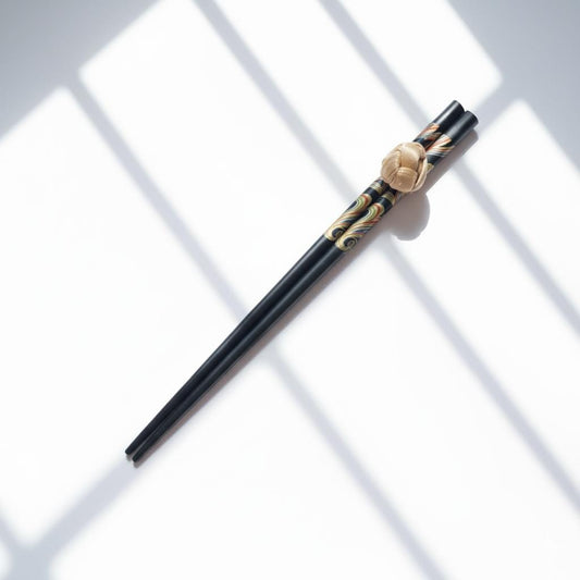 Japanese Chopsticks | Colourful Dragon Pattern Design | Gold Knot Rest | Black Lacquer