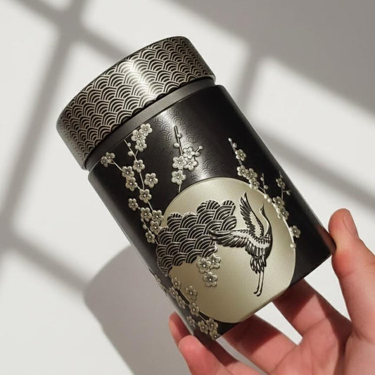 Japanese Tea Caddy Canister, Crane Cherry Blossom Design, Airtight Tin Storage Container, Black Silver | For Matcha, Tea, Spice, Coffee