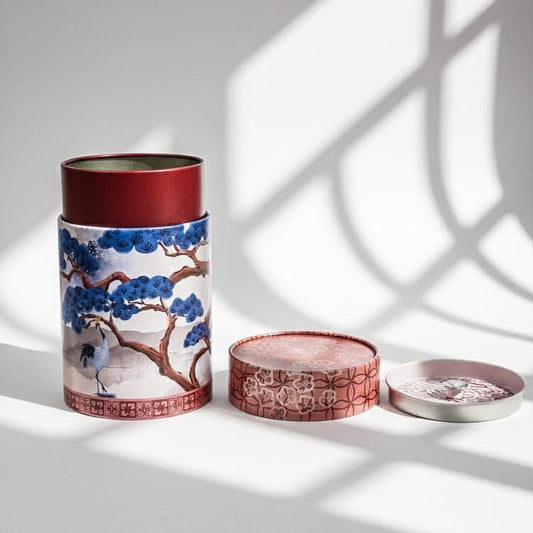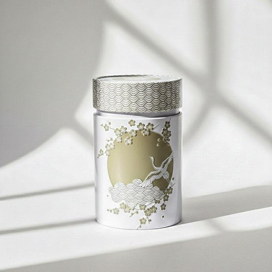 Japanese Tea Caddy Canister, Pine Tree & Crane Design, Airtight Tin Storage Container, White Silver | For Matcha, Tea, Spice, Coffee