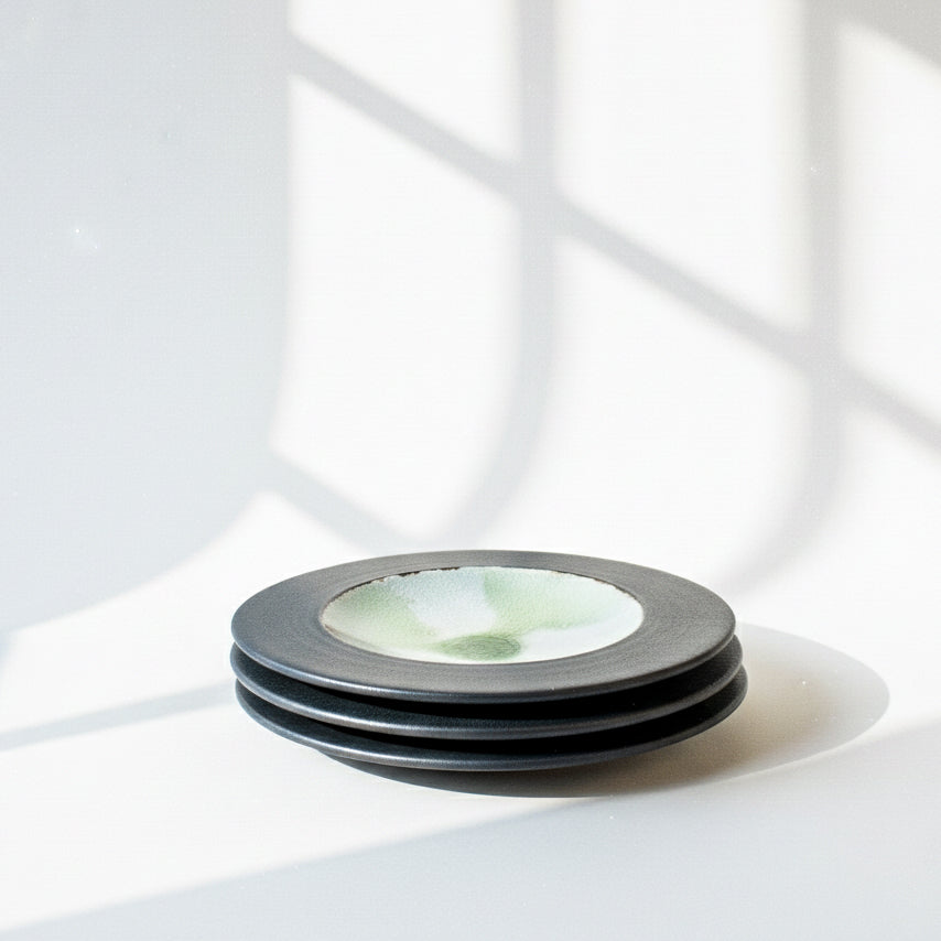 Expertly crafted in Japan, the Mino Ware Green Crackle Glass Ash Plate boasts a unique design with a cracked glaze and actual glass inserts in the centre that create a captivating visual effect. The outer rim is enhanced with ash after firing for a truly one-of-a-kind piece. Elevate your dining experience with this exquisite plate.
