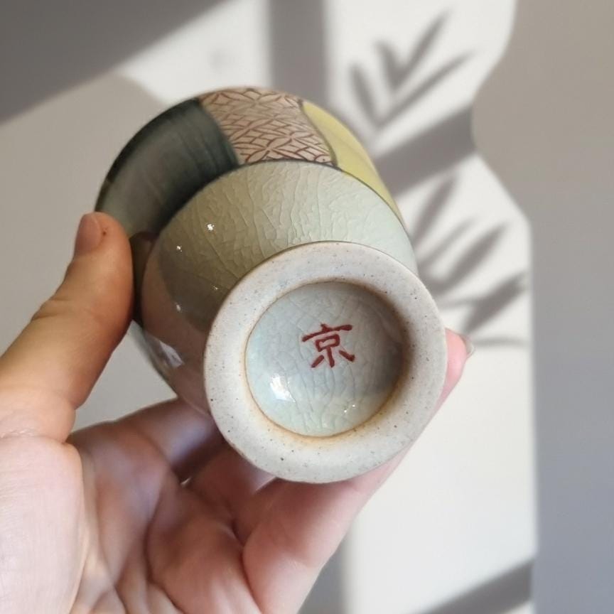 Experience the beauty of Japanese craftsmanship with this unique goblet, lovingly handcrafted and designed to elevate your tableware collection. The goblet features a striking blend of traditional and contemporary aesthetics—a patchwork of deep blue, vibrant yellow, and rich red glazes, paired with a delicate geometric motif for added elegance.