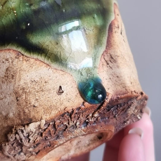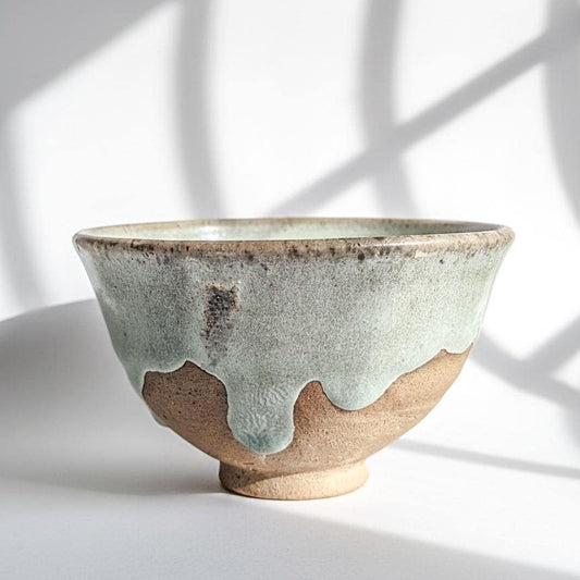 Oribe Ware Chawan Tea Cup, Japanese Pottery, Green Drip Glaze, Peace Motif