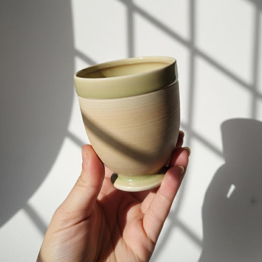 Vintage Japanese Ceramic Teacup, Footed Goblet | Yellow Sage Green Glaze | Handmade Yunomi | Reactive Glaze