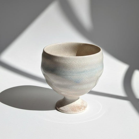 Vintage Japanese Ceramic Goblet | Cream Crackle Glaze | Blue Celadon | Handmade Stoneware | Footed Cup