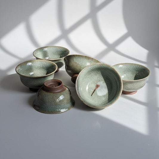 Vintage Celadon Crackle Glaze Tea Cup with Crane/Rooster Design, Handmade Ceramic Teacup