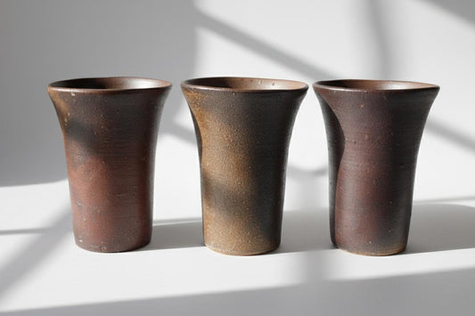 Set of 3 Bizen-yaki Beer Tumblers & Teacups | Handcrafted Japanese Bizen Ware | Iron-Rich Unglazed Stoneware with Original Box