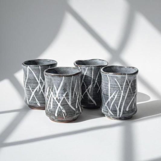 Handmade Mino-yaki Yunomi Teacup | Iguchi Shirakaba Stripe Gray | Hand-Painted Nezumi Shino Art Pottery [Made-to-Order]
