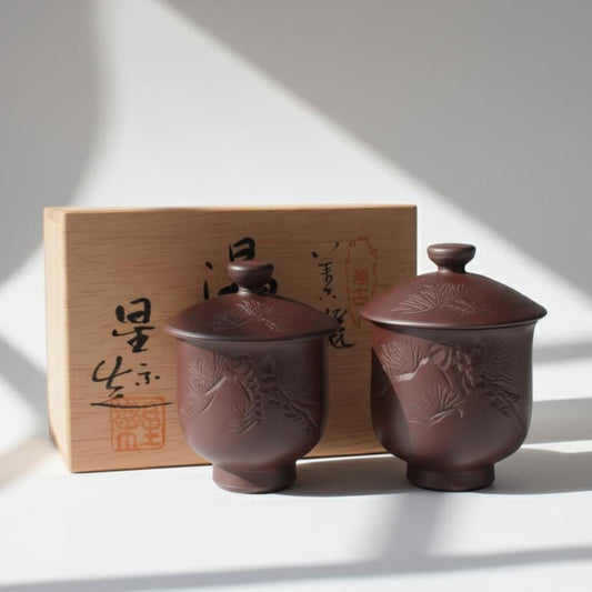 Lidded Banko Ware Clay Teacup Set | Hand-Carved Pine Design | Japanese Yunomi Set of 2 | Meoto Tea Set with Lids