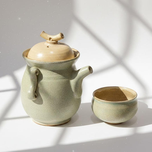 Handmade Japanese Kyusu Teapot Set, Celadon Stoneware Teapot with Cup