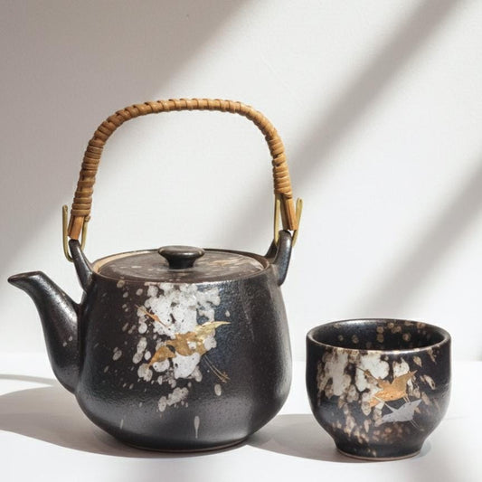 Vintage Japanese Teapot & Cup Set with Built-in Infuser | Gold Crane Design | Bamboo Handle