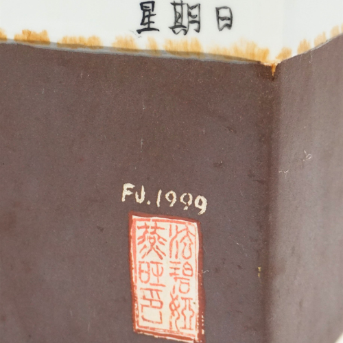 Large Fabienne Jouvin Paris Porcelain Chinese Vase, incised with her initials plus '1999' and a Chinese seal on the lower side. An accomplished artist and designer, Fabienne Jouvin has had a passion for mixing cultural designs and roams the world, from China to Cuba for her design ideas. Measures 5 3/4"x5 3/4"x12". Weight