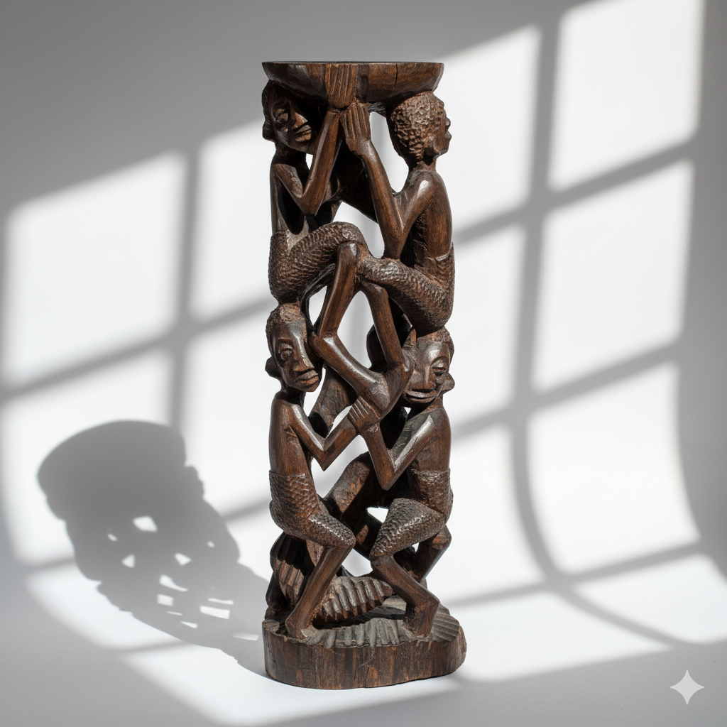 The Makonde are an ethnic group from Tanzania and northern Mozambique. Their Tree of Life sculptures were especially sought after in the 1950s and 60s. The sculptures represent the family unit and are essentially family trees. They depict family members from past and present holding each other up and growing taller and stronger through mutual support. An exceptional example of Makonde artistry.