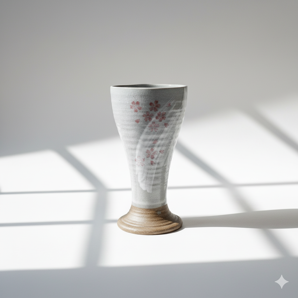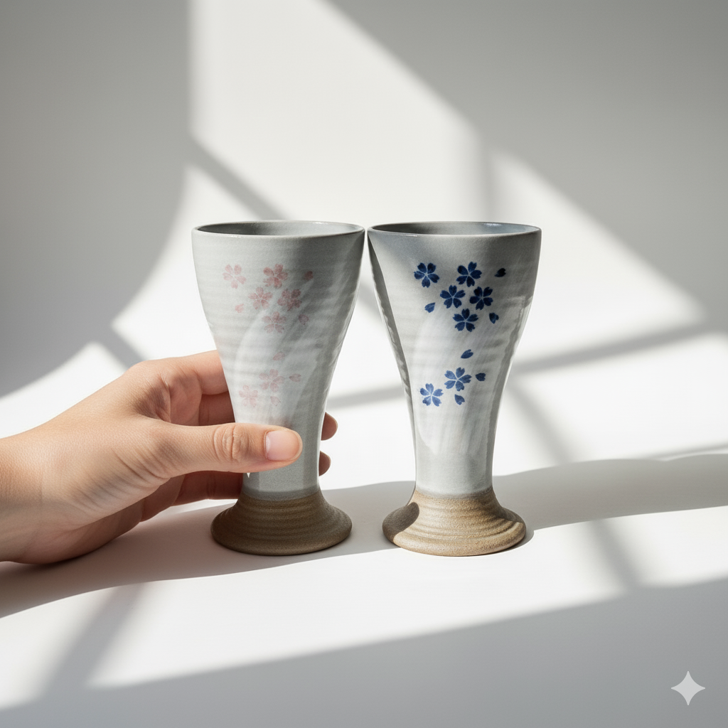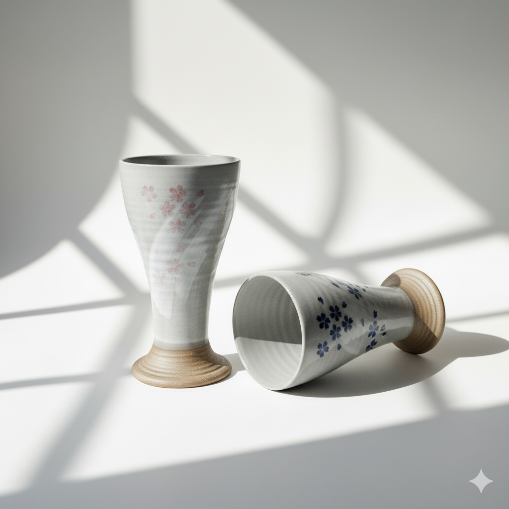 Set of 4 Hand Painted Sakura Ceramic Wine Goblets | Japanese